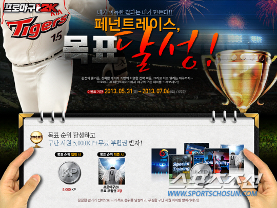 오는 7월 6일까지 매주 10개의 팀이 총 120경기를 펼치는 '페넌트레이스' 모드에 접속해 경기 시작 전 1위부터 6위 가운데 설정한 목표 순위를 달성하면 목표에 따라 'KP보너스(게임머니)'와 '무료 부활권' 아이템을 받을 수 있다.