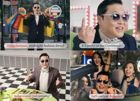 6편의 시리즈로 제작된 이 광고에서 싸이는 반찬, 불금(불타는 금요일), 코스메로드(화장품 판매점이 밀집한 명동거리), 동대문, 올레길, 삼겹살 등 한국관광 핵심 아이콘을 재치 있는 입담과 함께 소개한다.