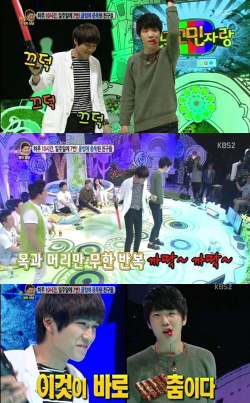 결국 이들은 춤을 보여 달라는 MC들의 요청에 목과 머리만 무한 반복해서 까딱대는 '시루떡춤'을 선보여 눈길을 끌었다. 그들은 이어 "이 춤이 6개월 째 광주 지역 클럽에서 유행하는 춤"이라고 덧붙여 방청객들을 폭소케 했다.