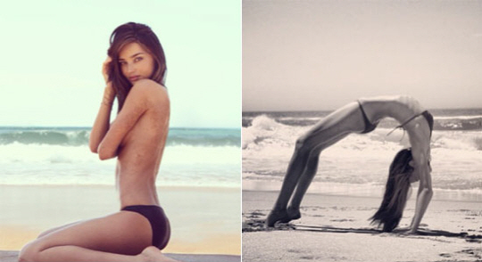 또 다른 사진 속 미란다 커는 비키니 차림으로 해변에서 고난이도의 요가 동작을 선보이고 있는 모습. 세계적인 톱모델답게 완벽한 비율의 몸매와 뛰어난 유연성을 자랑해 눈길을 끈다.