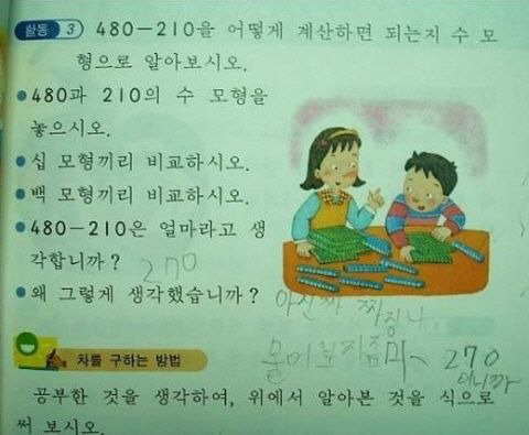해당 문제는 '480-210을 어떻게 계산하면 되는지 수 모형으로 알아보시오. 480과 210의 수 모형을 놓으시오. 십 모형끼리 비교하시오. 백 모형끼리 비교하시오. 410-210은 얼마라고 생각합니까?, 왜 그렇게 생각했습니까?' 등의 문제가 담겨 있으며 한 문제 치고는 지시사항이 너무 많다.