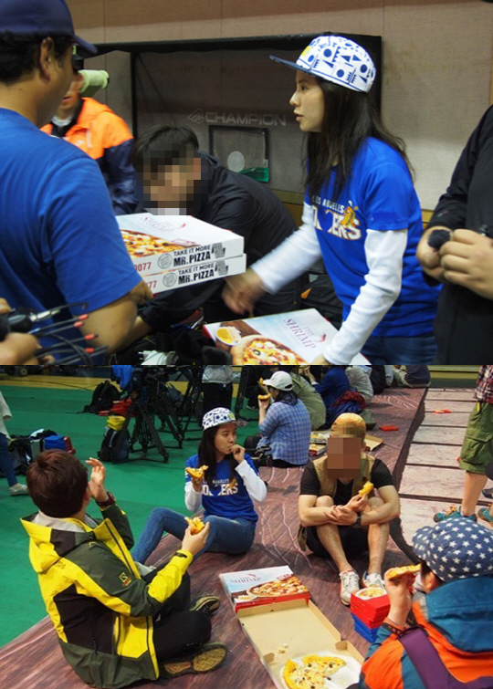 송지효는 이날 궂은 날씨와 지연되는 촬영 스케줄로 지친 스태프들에게 직접 피자를 돌리며 응원의 인사를 전해 촬영장 분위기를 화기애애하게 만들었다는 후문이다.