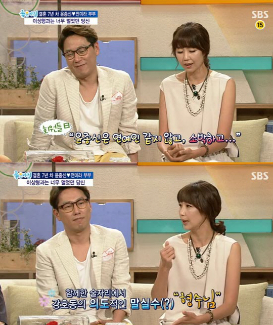 전미라는 "테니스 모임 중 신랑이 잠깐 화장실을 간 사이에 사람들이 신랑에 대해서 장점들이 막 이야기하기 시작했다"며 "'윤종신은 연예인 같지 않고, 소박하다' 뭐 그런 이야기를 하셨다"고 말했다. 이어 아내는 "처음에는 '그런가보다' 생각을 했는데 계속 들으니 덕분에 신랑의 이미지가 좋아졌다"며 당시를 회상했다.