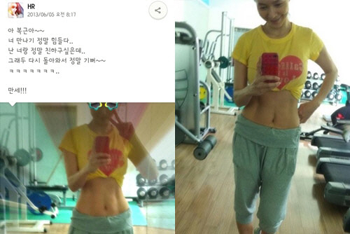 김혜리는 최근 자신의 미니홈피에 "아 복근아, 너 만나기 정말 힘들다. 난 너랑 친하고 싶은데. 그래도 다시 돌아와서 정말 기뻐"라는 글과 함께 두 장의 사진을 게재했다.