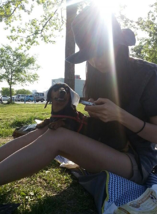 사진 속 윤승아는 긴 생머리를 풀어 헤친 채 벙거지 모자를 쓰고 앉아 있는 모습이다. 이어 강아지와 함께 돗자리를 깔고 앉아 여유롭게 광합성을 즐기고 있다.