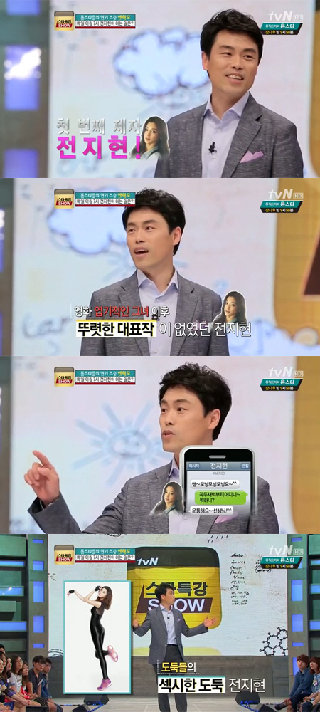 그는 "어느 날 아침 7시 전지현한테 문자가 왔길래 '어디냐'고 물었더니 운동한다고 하더라"며 "전지현은 매일 아침 7시 운동을 했다. 영화 '도둑들' 예니콜 역할 속 몸매를 매일매일 운동을 통해 관리한 거다"라고 밝혔다.