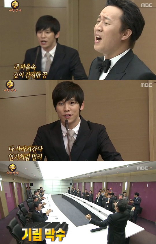 이에 무한상사에서는 '인사과 신입사원' 홍광호의 진행으로 긴급 주주총회가 열리고, 정준하가 차에서 내려 회의실로 들어가는 장면부터 뮤지컬 '지킬 앤 하이드' 대표곡 '지금 이 순간'이 흘러나온다.