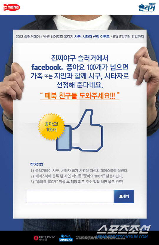 네오위즈게임즈는 온라인 야구게임 '슬러거'에서 넥센 히어로즈 홈 경기 시구, 시타자를 선정하는 '슬러거데이' 이벤트를 진행한다.