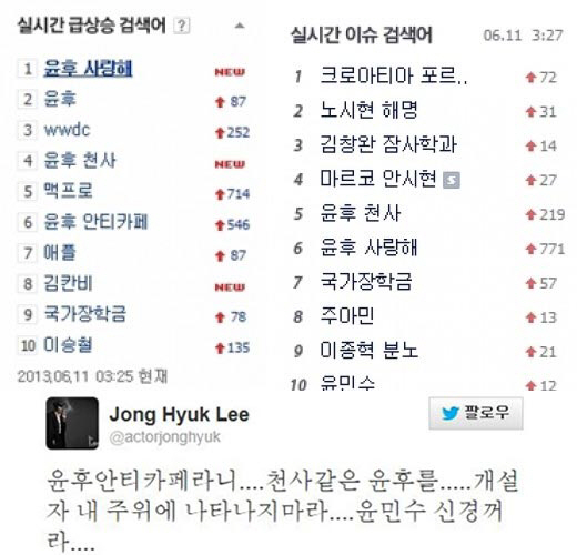 윤후의 안티 카페 등장에 MBC '일밤-아빠 어디가'에 함께 출연 중인 이종혁 역시 자신의 트위터를 통해 카페 개설자에게 분노를 표출 한 것.