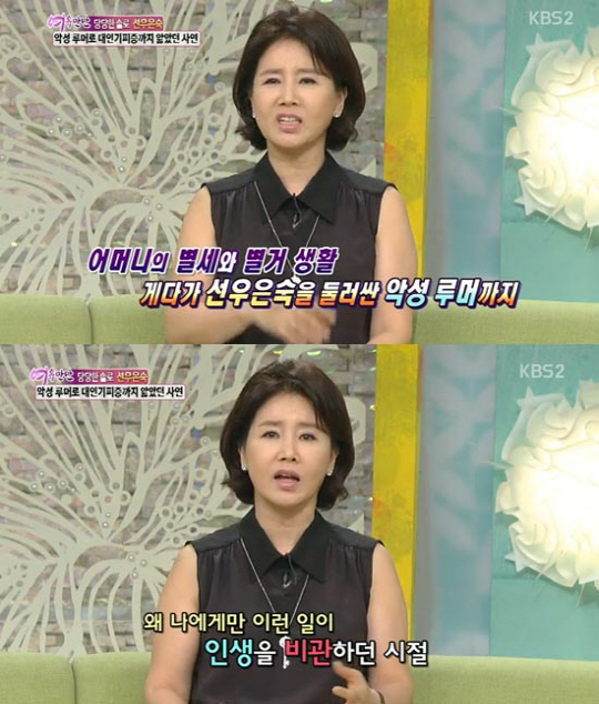 선우은숙은 11일 방송된 KBS 2TV '여유만만'에 출연해 루머로 힘들었던 과거에 대해 털어놨다.