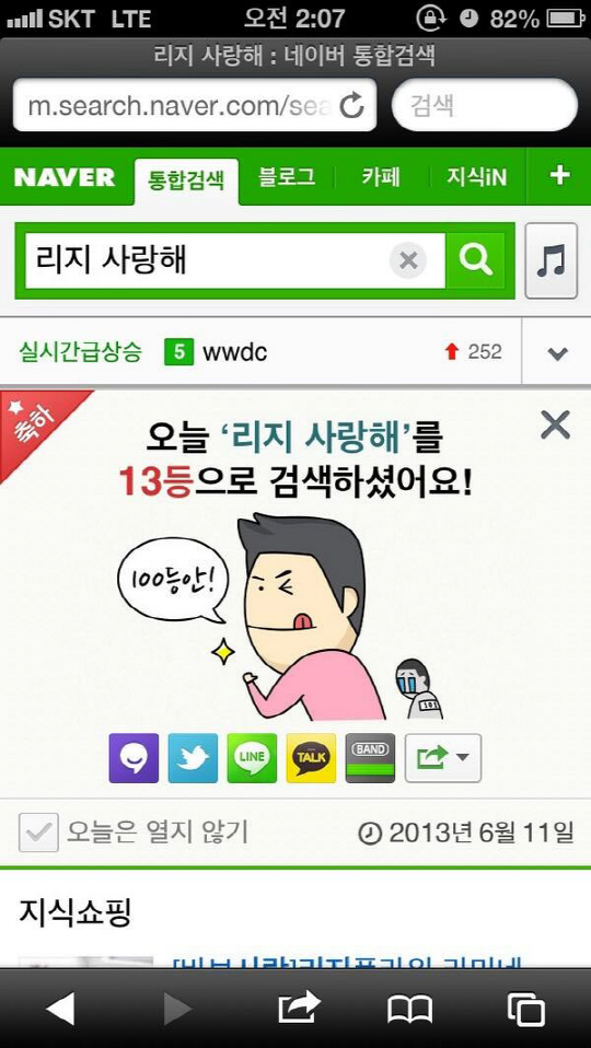 리지가 게재한 사진에는 포털 사이트 검색창에 '리지 사랑해' 라는 문구가 적혀 있어 네티즌들을 폭소케 했다. 특히 리지 외에 '리지 사랑해'를 검색한 네티즌들이 12명이 더 있어 시선을 끌었다.