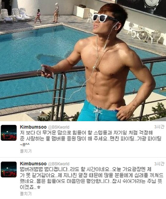 김범수는 11일 자신의 트위터에 "범DJ입니다. 라디오 할 시간이네요. 오늘 가요광장엔 제가 못 갈 것 같아요"라며, "제 지나친 열정 때문에 많은 분들에게 심려를 끼쳐 드렸네요"라고 심경을 전했다.
