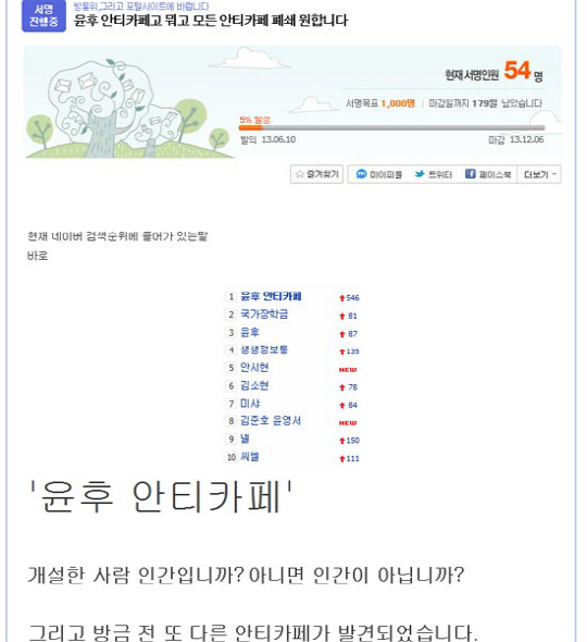 '윤후 안티카페' 관련 논란이 지속 되자, 10일 다음(Daum)아고라에는 '윤후 안티카페' 폐쇄 과련 청원이 두건이나 올라왔다.