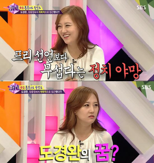 이어 MC김구라는 "도경완이 검정고시를 보고 홍익대학교 공대 학생회장까지 했다고 하더라"라고 밝혔다. 이어 그는 "프리선언보다 정치 쪽에 헛바람 드는 게 가장 무서운 것이다"고 말하자, 박지윤은 "약간 도경완이 그런 쪽에 색깔을 보인다"며 덧붙여 말해 장윤정을 당황케 했다.