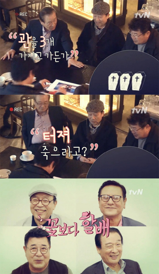 특히 막내 백일섭은 나영석 PD의 "열기구를 한번 타는 것은 어떠시냐"는 미션 권유에 곧바로 "터져 죽으라고?"라며 반문해 웃음을 자아낸다.
