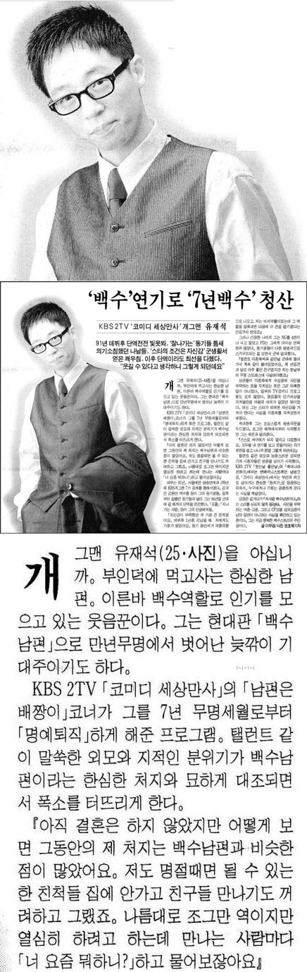 기사 속에는 "백수 연기로 만년 무명에서 벗어난 늦깍이 기대주"라고 소개하며, 유재석이 "그동안 제 처지가 백수남편과 비슷했다. 명절때 친척 집에 안가고 친구들 만나기도 꺼려했다"는 솔직한 심경이 담겨있다.