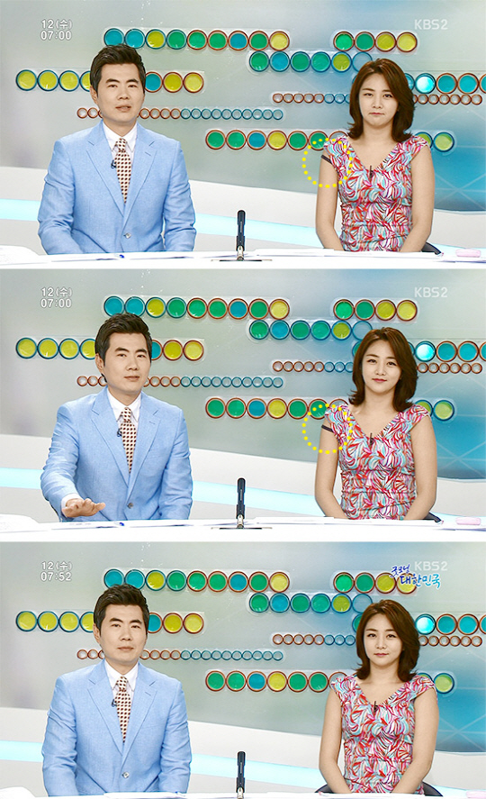 공개된 사진 속 정다은은 12일 아침 방송된 KBS2TV '굿모닝 대한민국'을 생방송으로 진행하던 중 민소매 원피스를 입은 한쪽 어깨 속옷이 흘러내려 어깨 위로 끈이 노출된 것.