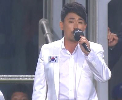 이승철은 '보컬의 신'이라는 별명에 걸맞게 빼어난 가창력으로 애국가를 안정적으로 소화했다. 특히 이날 입고나온 흰색 정장 상의 오른쪽에 반짝이는 태극이를 달고 나와 시청자들의 눈길을 사로잡았다.