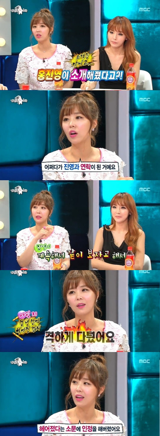 이후 결별 3개월 만에 다시 재결합 하게 된 배경에 홍진영이 있었다는 사실을 밝혀 시선을 모았다. 신지는 "재결합 소문의 최측근이 지금 이 자리에 있다"며 옆에 앉아있던 홍진영을 가리켰다. 이어 그녀는 "당시 홍진영이 새 앨범 홍보를 위한 기자 인터뷰에서 기자가 내 근황에 대해 묻자 '언니, 요즘 잘 지내는데'라고 말한 게 재결합설이 퍼지게 된 원인이다"라고 설명했다.