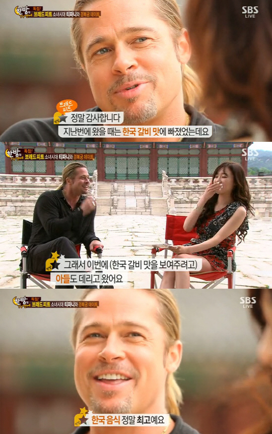 이날 방송에서 브래드 피트는 "지난번에 왔을 때 한국의 갈비 맛에 빠졌다"며 "그래서 이번에 (한국 갈비 맛을 보여주려고) 아들을 데리고 왔다. 한국 음식 정말 최고다"고 말해 눈길을 끌었다.