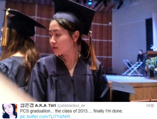심은경은 14일 자신의 트위터에 "PCS graduation. the class of 2013. finally I'm done"라는 글로 자신의 졸업을 알리며 졸업 인증 사진을 함께 게재해 눈길을 끌고 있다.