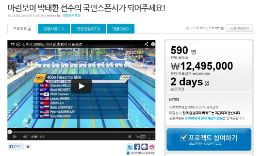 프로젝트를 통해 모금된 후원금은 후원자들의 이름과 응원메시지를 넣은 응원 책자와 함께 박태환 선수에게 전달될 예정이다.