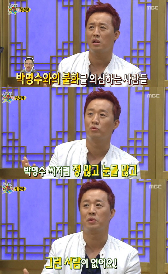 이어 그는 당시 불거졌던 박명수와의 불화설에 대해 "많은 사람들이 '박명수와 불화가 있는 것이 아니냐'고 얘기를 많이 했다. 하지만 박명수처럼 정 많고 눈물 많은 사람이 없다"고 밝히며 박명수와의 불화설을 일축했다.