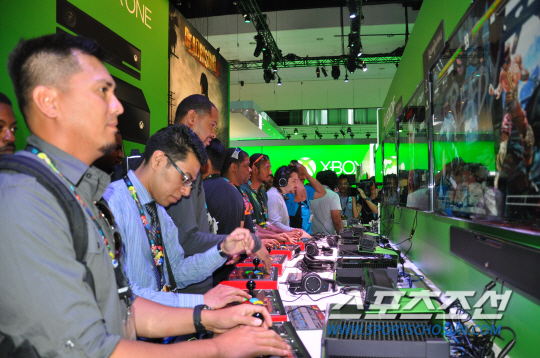 ◇'E3 2013'에서 새롭게 선보인 마이크로소프트의 'X박스 원' 게임기로 관람객들이 게임을 즐기고 있다. LA=남정석 기자