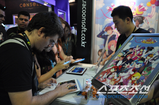 ◇'E3 2013'에 출품한 국내 모바일게임사 라쿤소프트의 부스 앞에서 관람객들이 게임을 시연해보고 있다. LA=남정석 기자