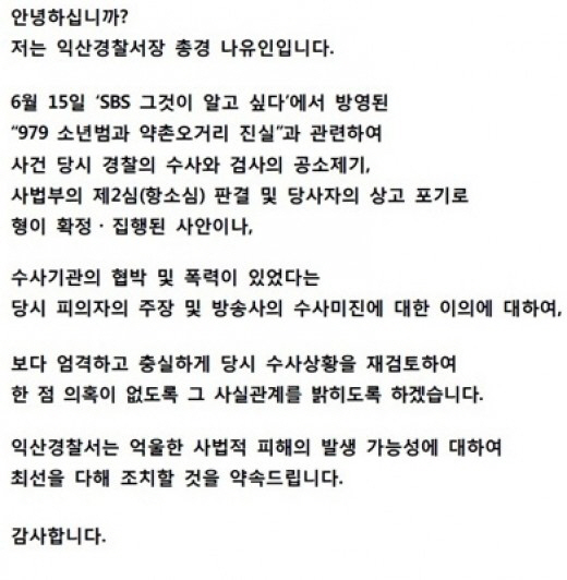 '979 소년범과 약촌 오거리의 진실' 진범으로 지목된 소년이 "강압에 의한 자백이었다"고 주장하자, 담당했던 익산경찰서가 공식입장을 밝혔다.