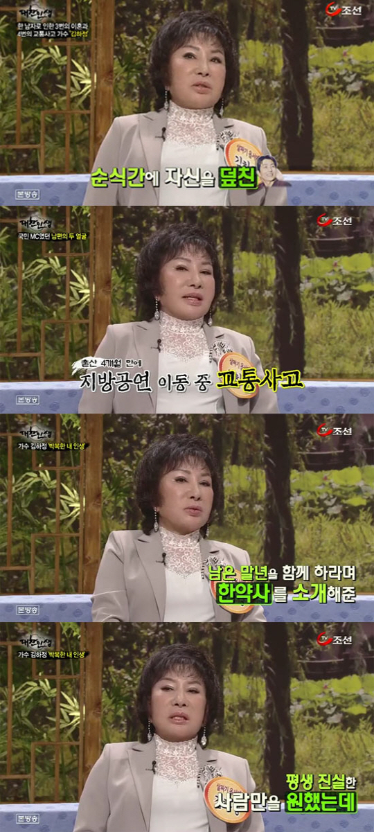 가수 김하정이 3번의 이혼과 4번의 교통사고로 살아온 반복한 인생스토리를 공개해 화제를 모으고 있다.