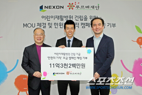 넥슨 컴퍼니는 20일 푸르메재단과 협약식을 갖고 푸르메어린이재활병원 건립 기금 조성에 협력하기로 했다. 왼쪽부터 푸르메재단 강지원 대표, 가수 션, 넥슨코리아 서 민 대표.