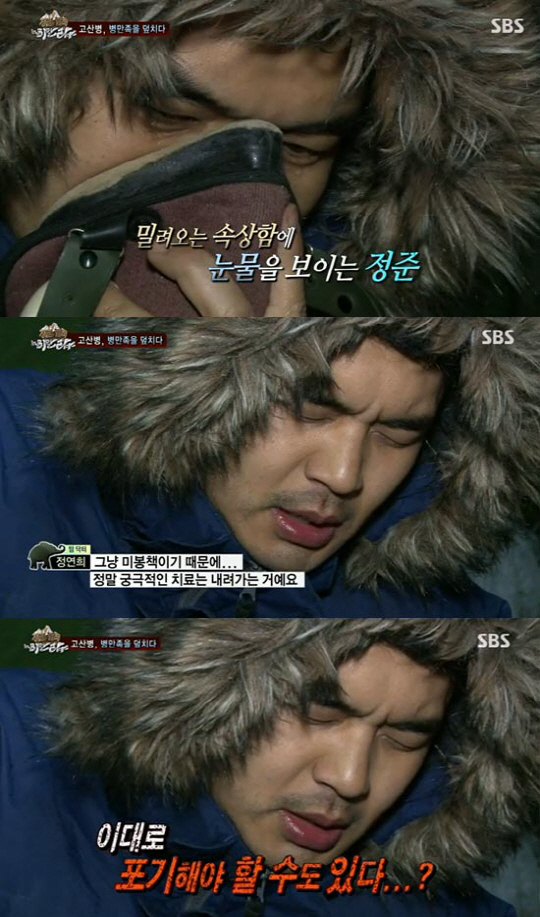 정준은 "너무 힘들다. 머리가 아프고 속이 너무 미식 거려서 힘이 들다. 숨을 쉬어도 쉬는 것 같지 않다"며 증상을 호소해 결국 베이스캠프로 향했다.