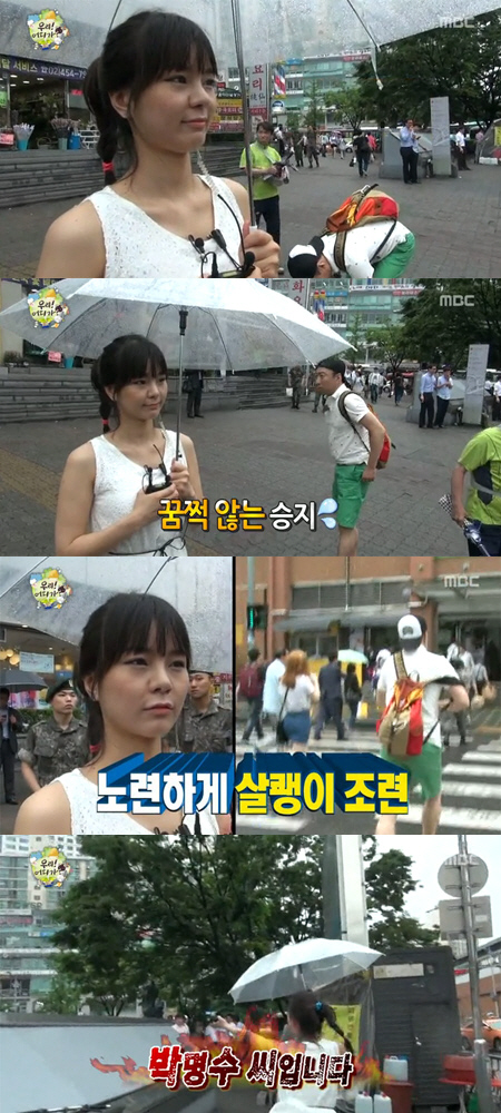 귀여운 외모의 맹승지는 이날 탁월한 예능감과 엉뚱하면서도 발랄한 매력으로 시청자들의 눈길을 끌었다. 특히 맹승지는 '시민 코스프레'를 하고 발연기를 펼치며 자신의 눈에 띄려고 노력하는 박명수를 노련하게 조련해 웃음을 자아냈다.
