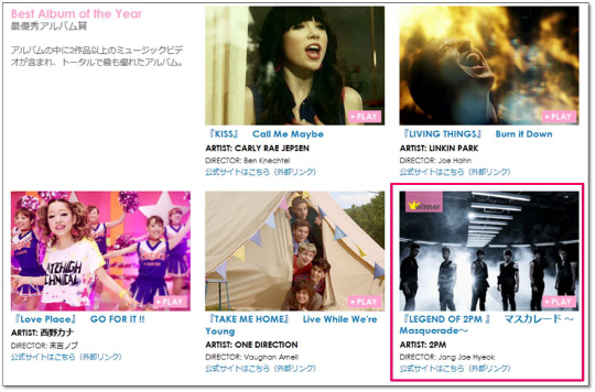 2PM이 MTV VMAJ 2013(MTV Video Music Awards Japan2013)에서 일본 정규 2집 'LEGEND OF 2PM'으로 최우수 앨범상을 수상했다.