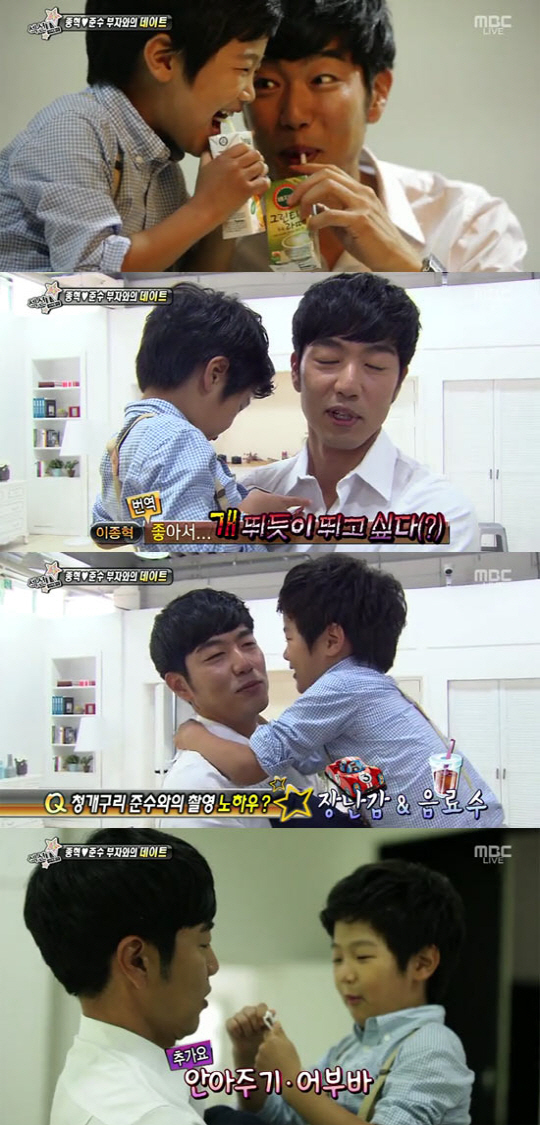 이어 이종혁은 "준수 때문에 힘들다. 청개구리라서 웃으라면 우는 표정을 짓는다"면서도 "촬영 노하우는 장난감과 음료수다"라고 자신만의 무기를 공개했다. 그러자 안겨있던 준수는 "안아주기, 어부바하기"를 덧붙여 눈길을 끌었다.