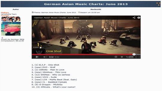 독일 현지 시간으로 지난 22일에 공개된 6월의 독일 아시안 음악 차트(German Asian Music Chart)에 따르면 B.A.P의 두 번째 미니앨범 타이틀곡인 '원 샷'이 4개월 째 1위를 고수했다. 지드래곤, 샤이니, 인피니트, EXO 등 현재 국내외에서 최고의 인기를 구가하고 있는 K-POP 가수들이 뒤를 잇고 있어 또 한 번 독일 차트를 장악한 B.A.P의 인기가 폭발적임을 입증했다.