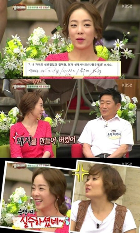 그런데 이를 들은 박경림이 "50kg이 넘으면 돼지냐?"고 흥분해 웃음을 자아냈다. 그러자 박은영의 아버지는 "보통 여자들이 50kg에서 왔다 갔다 하지 않느냐"고 말했고, MC 박미선은 "아버님 여자들이 그렇게 덜 나가지는 않아요"라고 너스레를 떨어 웃음을 자아냈다. <스포츠조선닷컴>