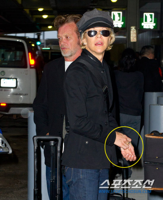 맥 라이언과 록가수이자 10살 연상 남자친구인 존 멜렌캠프(61)가 이탈리아에서 열린 '제59회 타오르미나 필름 페스티벌'에 참석 후 23일(현지시간) 미국 뉴욕 JFK 국제공항에 도착한 모습이 현지 기자들에게 포착됐다.