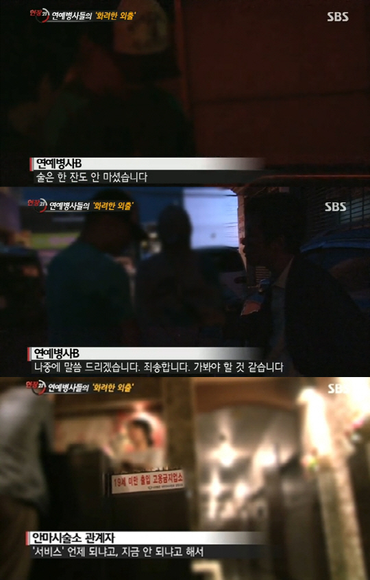 공연 뒤 사복차림으로 숙소를 빠져나온 연예 병사들은 밤 10시 술을 곁들여 늦은 저녁을 했다. 숙소로 복귀한 이들 중 일부는 새벽 다시 택시를 타고 어디론가 떠난 뒤 2시간 후 돌아왔다.
