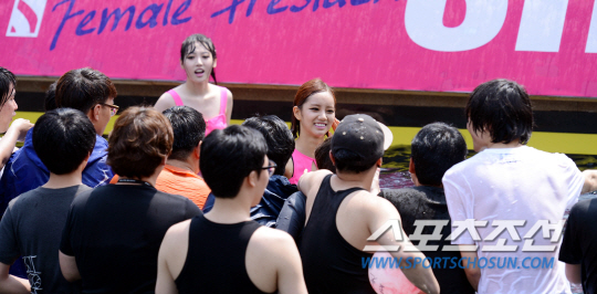 24일 서울 반얀트리 호텔 수영장에서 열린 쇼케이스에서 '여자 대통령'을 선보인 걸스데이는 기존의 깜찍함을 넘어서 카리스마 있는 섹시미를 선보였다. 사진은 쇼케이스를 마친 걸스데이가 수영장에 뛰어들어 팬들을 즐겁게 하고 있는 모습. 조병관기자 rainmaker@sportschosun.com