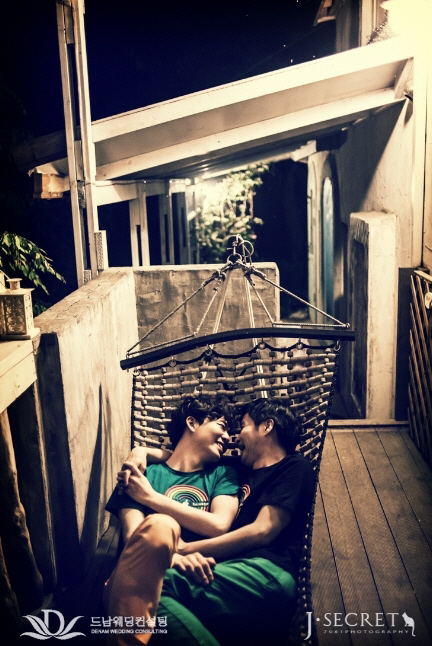 사진 속 김조광수와 김승환은 편안한 복장 차림으로 해먹 위에 나란히 누워있는 모습이다. 녹색과 검은색으로 색만 다른 커플티를 입고 있는 이들은 서로를 바라 본 후 사랑스런 미소와 함께 환한 웃음을 짓고 있어 눈길을 끌고 있다.