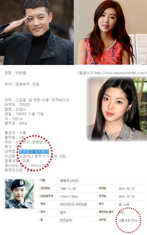 박한별의 개인 프로필 사항 중 좌우명란에는 '후회할 짓 하지 말자'라는 글귀가 적혀 있는 모습이다. 그러나 국방 홍보원 홈페이지에 올라온 세븐 프로필 좌우명란에는 '그럴 수도 있다'라고 적혀 있어 상반된 좌우명에 네티즌들의 눈길이 쏠렸다.