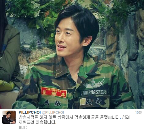 최필립은 26일 새벽 자신의 트위터에 "'현장21'이 뭐지? XX 집단인가? 이딴 사생활 캐서 어쩌자는 거지? 미친XX들"이라며 "너희들은 그렇게 깨끗하냐? 참나"라는 글을 연이어 게재했다. 이후 논란이 불거지자 최필립은 자신의 글을 삭제한 뒤 다시 트위터에 "방송시청을 하지 않은 상황에서 경솔하게 글을 올렸습니다. 심려 끼쳐드려 죄송합니다"라고 적으며 사과했다.