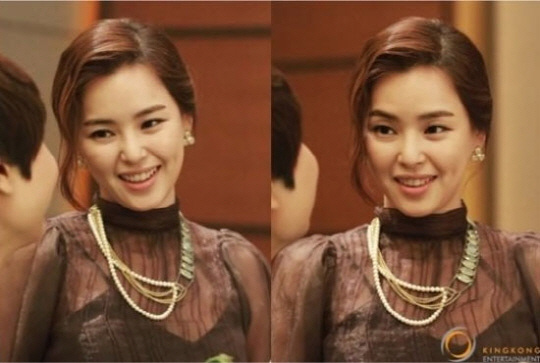 특히 갈색 시스루 블라우스에 업스타일 헤어로 고급스러운 오피스 룩을 연출하고 있는 그녀는 진주 장식이 가미된 목걸이와 귀걸이로 포인트를 줘 한층 우아함을 더했다.