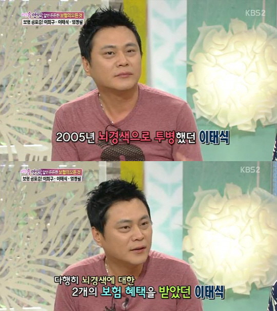 이날 방송에서 이태식은 "현재 질병관련 보험과 병원비가 나오는 실비(실손)보험에 들었다"며 말문을 열었다. 이어 그는 "지난 2005년 뇌경색으로 쓰러져 병원에 입원 했었다. 당시 왼쪽에 마비가 왔었다"며 당시를 회상했다.