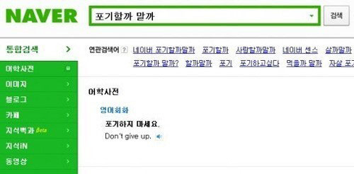 네이버 검색창에 '포기할까 말까'를 검색하면 '포기하지 마세요'(Don't give up)라는 문구가 뜬다. 어학사전 영어회화 내용을 보여주는 글이다. 네티즌들은 관리자의 따뜻한 배려가 돋보인다는 반응을 내놓고 있다.