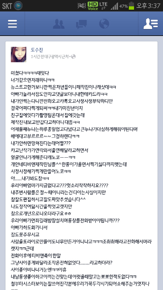 도수진 씨는 28일 자신의 페이스북에 "미쳤다. 재밌다. 당신들은 저렇게 하나. 뉴스 뜨고 하는 걸 보니 '찍은 사람들이나 제작진이나' 하더라. 아빠가 놀라 잠도 안자고 댓글 보시고 나한테 그러시더라"라고 밝혔다. 이어 "내가 안찍는다니까 전화 오고 카톡 오고 사정사정 부탁해 결국 어쩌다 찍게 됐다. 친구집에 있다가 촬영팀이 온대서 집에 갔는데 제작진이 반갑다고 하더니 대뜸 '어제 둘째 누나는 하루종일 업고 다녔으니 큰 누나가 더 심하게 해줘야 한다'며 배에 대고 부르르르~ 그걸 하랬다. 내가 안하면 망쳐진다는데 어떻게 하나"라고 전했다. 또 "작가가 얼굴 안나가게 해준다 해놓고, tvN 제작진님들 (도)한동이가 울면서 찍기 싫다고 했는데 사정사정 해가며 찍게 만들어 놓고. 내가 봐도 참. 우리 아빠 엄마가 지금 없다고? 헛소리 작작하죠? 내 주변 사람들은 절대 아니라는 걸 다 안다. 참 잘도 편집하고 잘도 짜맞추셨다. 나도 8시간을 찍었지만 참 그렇게 나왔다. 우리 아빠가 무슨 죄가 있어 밤잠 설치며 동창들 전화를 받아야 되나. 아빠가 하도 화가 나서 잠도 못 주무셨다. 사람을 바보로 만들어도 너무 만든 거 아니냐고 조취 취하라고"라고 분노했다.