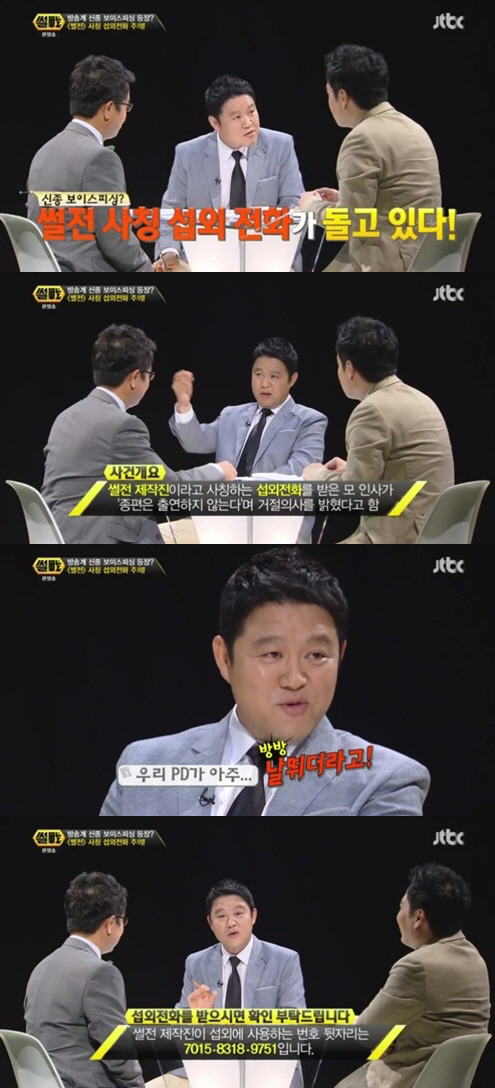이날 김구라는 "제작진을 사칭한 사람이 모 인사를 섭외했는데 그분이 자기 생각하고 틀려서 섭외를 거절했나 보더라"며 "이후 그분이 '썰전 섭외를 거절했다'고 글을 남겼더라"며 사칭 전화 내막을 공개했다.