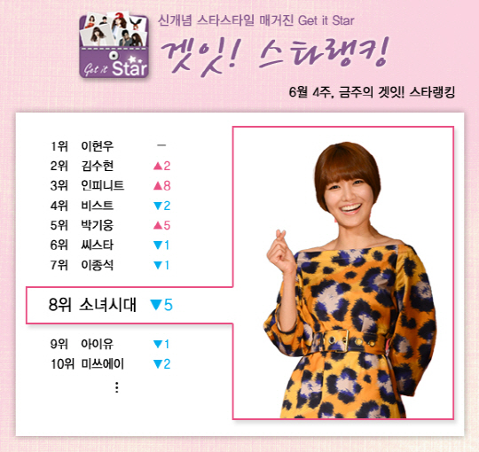 겟잇스타랭킹 2013년 6월 4주차! 가장 눈길을 끄는 것은 소녀시대의 순위 하락입니다. 금주에 5계단을 내려앉아 8위까지 떨어졌네요. 그간 꾸준히 상위권을 유지하며 걸그룹의 선두주자 역할을 했던 소녀시대인데 아쉽습니다. 빨리 컴백해서 흔들리는 팬들의 마음을 사로잡아야겠어요.